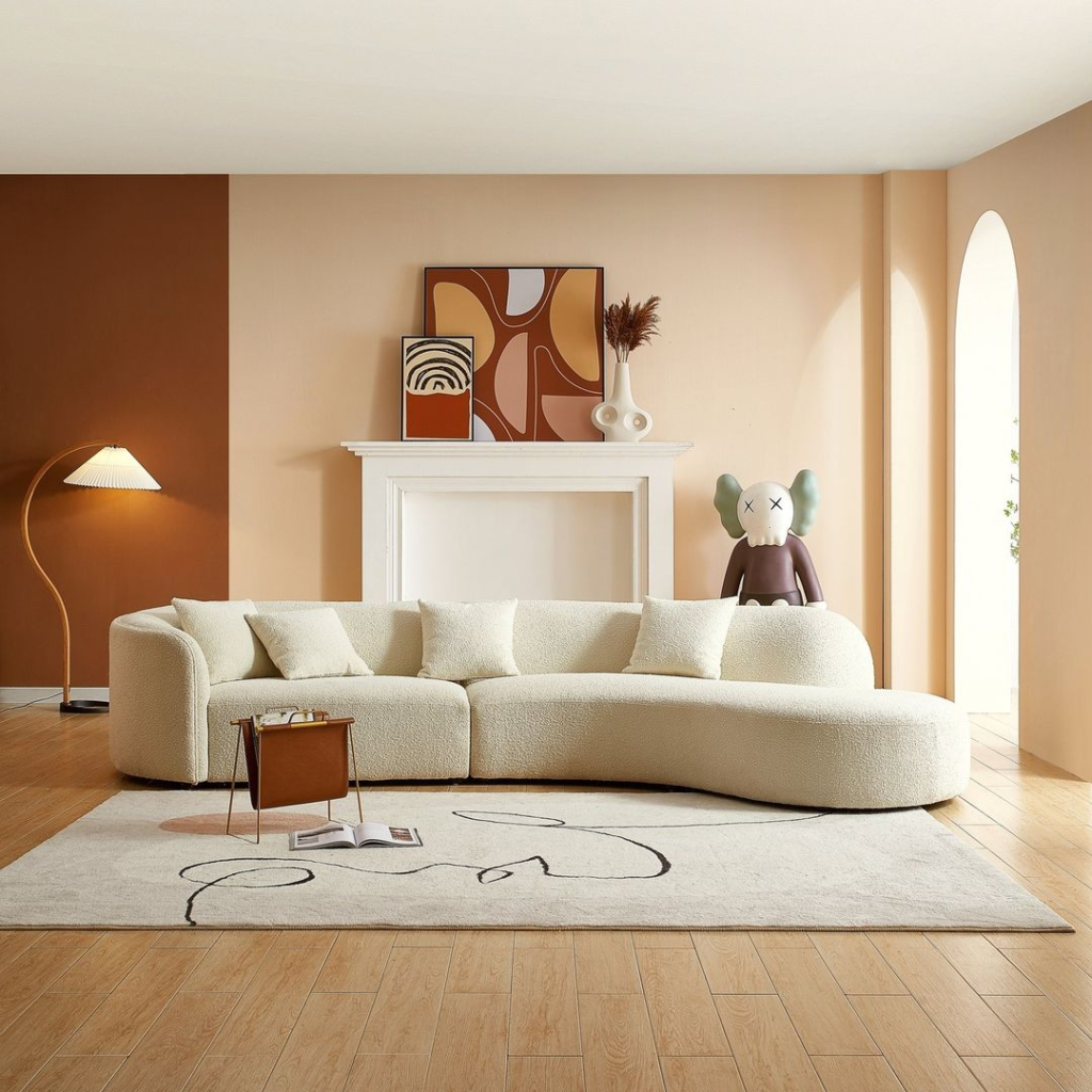 The curvaceous white couch softens the room’s geometric elements, creating a comfortable lounging area. Warm-toned walls and vibrant abstract art provide an energetic backdrop. A whimsical floor lamp and playful decor add an eclectic touch. A simple area rug anchors the space, achieving a balanced look.