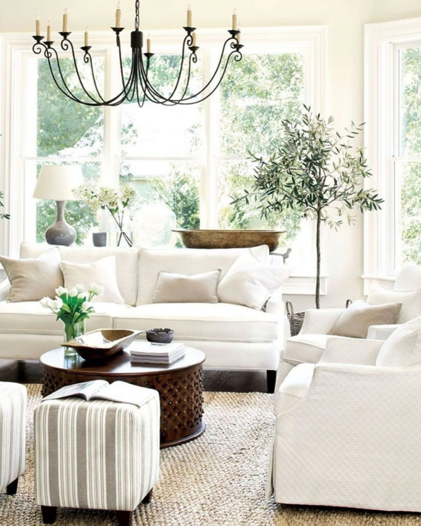 White couches bring classic elegance to a space with a lush outdoor view. A traditional chandelier adds grandeur overhead, while striped ottomans and a round wooden coffee table introduce varied textures. Indoor greenery mirrors the garden view, creating a unified, nature-inspired atmosphere.