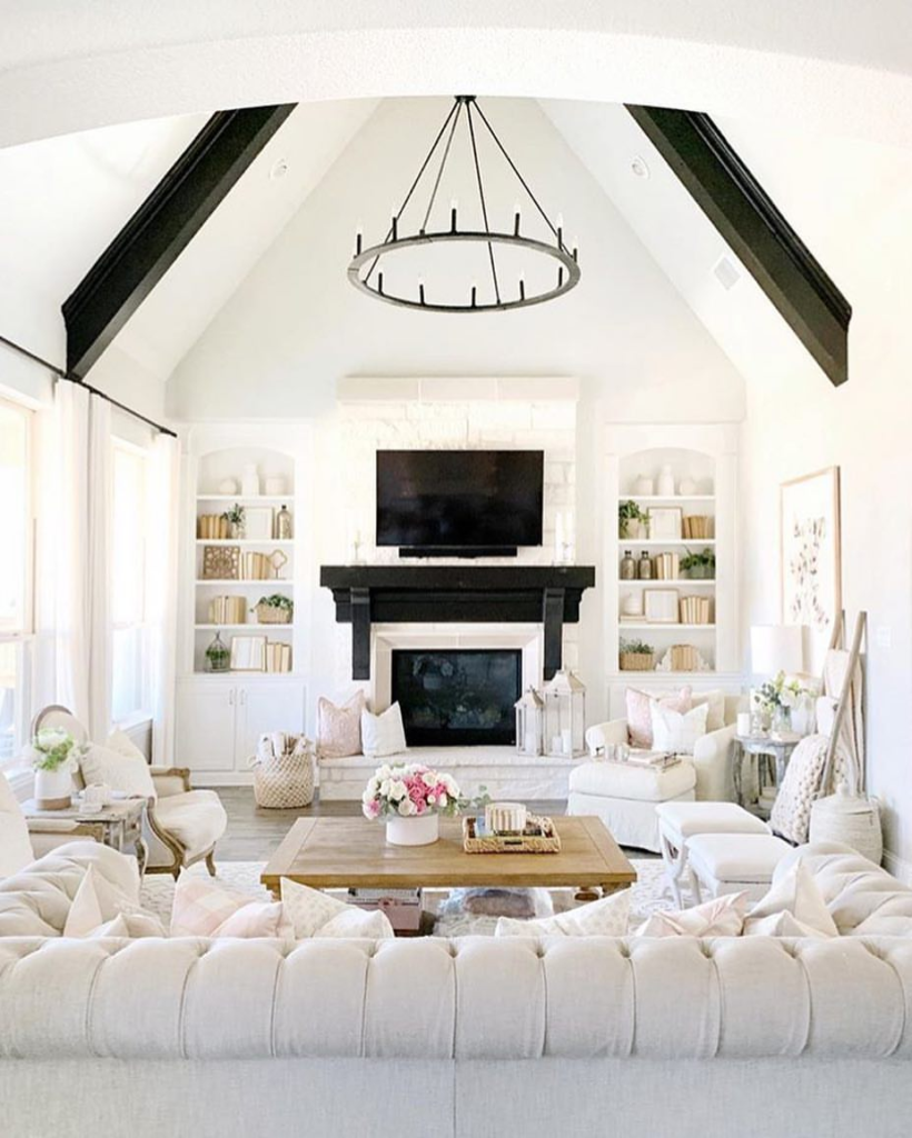 The white tufted couch is the centerpiece of a room with dramatic cathedral ceilings. An industrial chandelier adds a bold touch, while soft pillows and floral elements bring in subtle color and texture. Built-in shelving and a classic fireplace frame the space, contributing to its elegant charm.