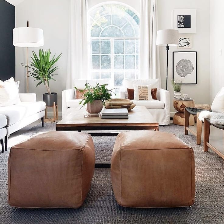White couches create a fresh and airy ambiance, complemented by lush indoor plants. Leather poufs add rich texture and a touch of earthiness. Natural light from the large window highlights the couch’s clean lines. Artwork and modern lighting bring a personal touch to this botanical-inspired setting.