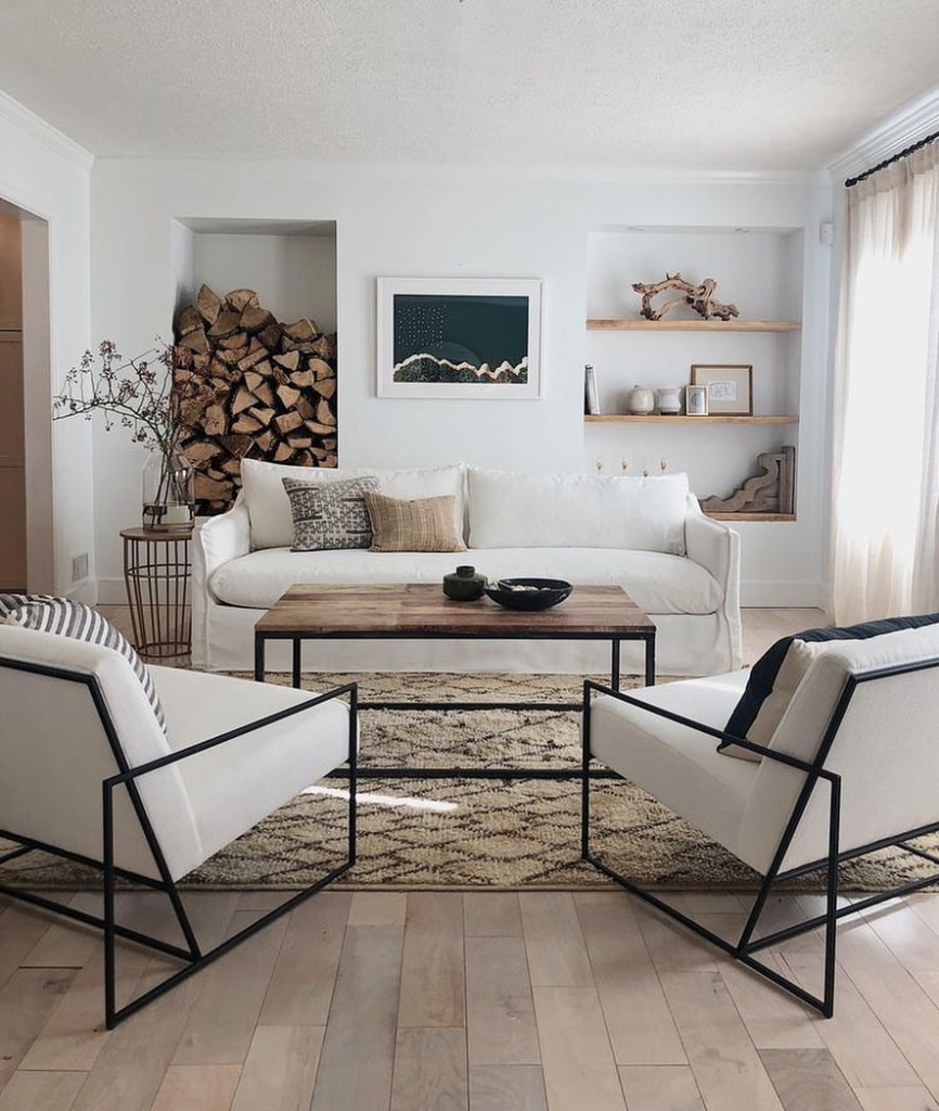 The white couch offers a clean and inviting surface in a space defined by warm neutrals. Geometric armchairs frame the area with modern lines, providing contrast. Natural wood elements and a cozy firewood nook evoke rustic charm. Textured throws and a patterned rug enhance the minimalist haven’s comfort.