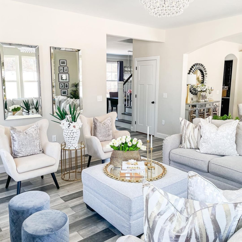 White couches are paired with elegant accent chairs to create a sophisticated conversation area. Mirrors strategically placed enhance the room’s brightness and spaciousness. The mix of textures, from a tufted ottoman to silky pillows, adds a luxurious feel. A sparkling chandelier punctuates the room, merging glamour with comfort.