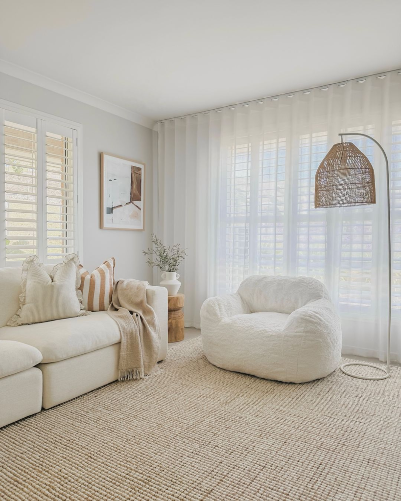 The white couch, along with a plush armchair, offers varied seating options in a light-filled space. Sheer curtains diffuse sunlight, contributing to a calm ambiance. Natural wood accents and a woven rug introduce earthy elements. Contemporary art and a pendant lamp add to the modern yet cozy atmosphere.