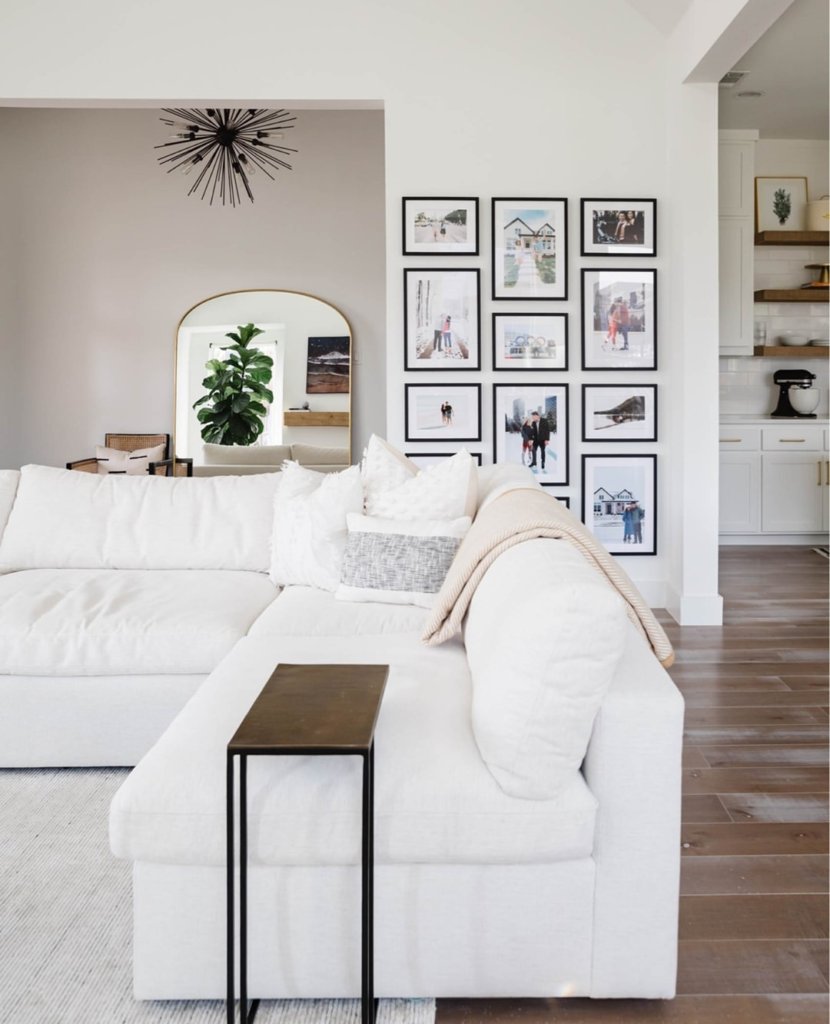 The white couch sets a relaxed tone, enhanced by a curated gallery wall that adds personal flair. A minimalist side table provides a modern touch next to the plush cushions. Warm throws and natural wood elements invite comfort. Starburst wall decor adds a mid-century nod, punctuating the space with style.