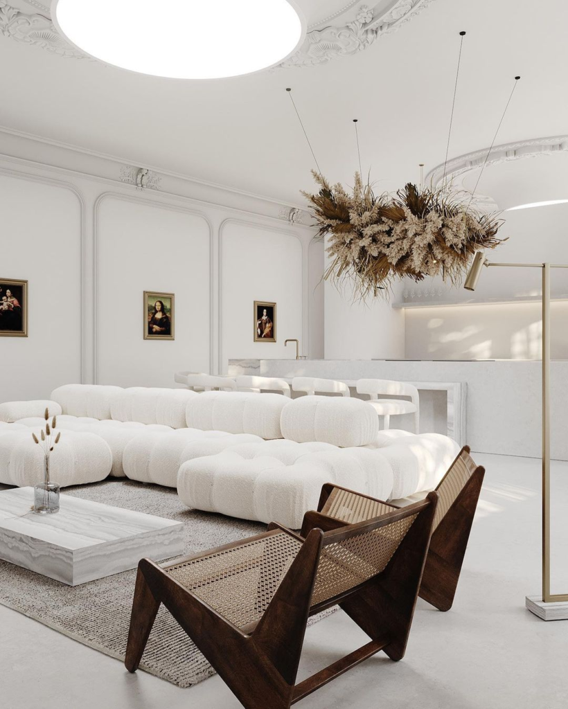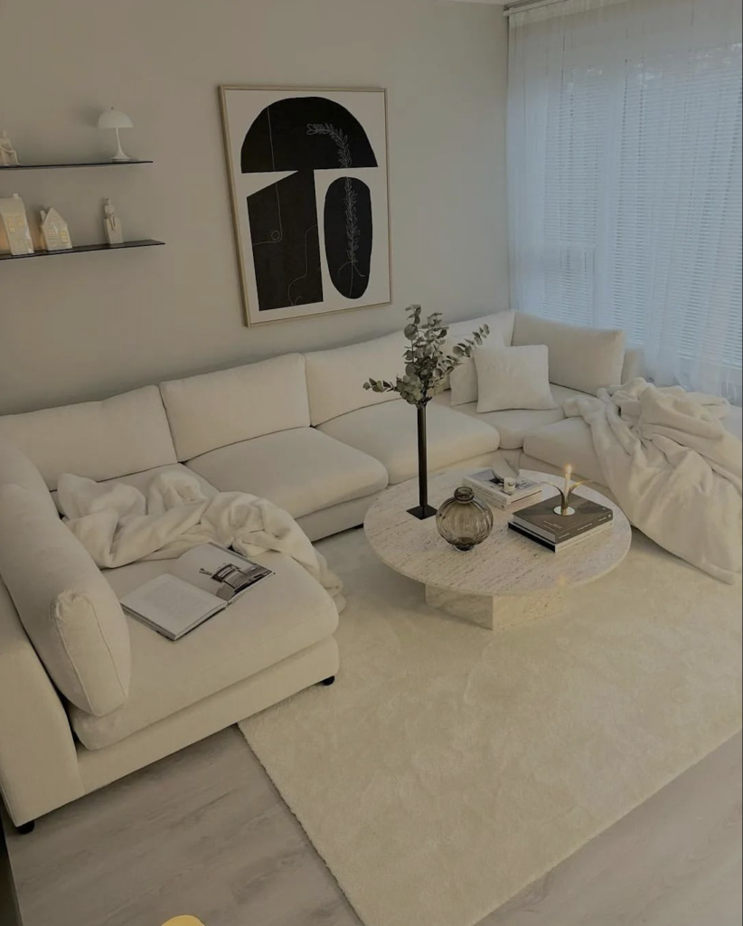 The white couch epitomizes minimalist luxury with its plush cushions and clean lines. A circular marble coffee table adds a chic touch, while soft lighting and neutral decor create a calming atmosphere. Abstract wall art brings a touch of sophistication to the space.