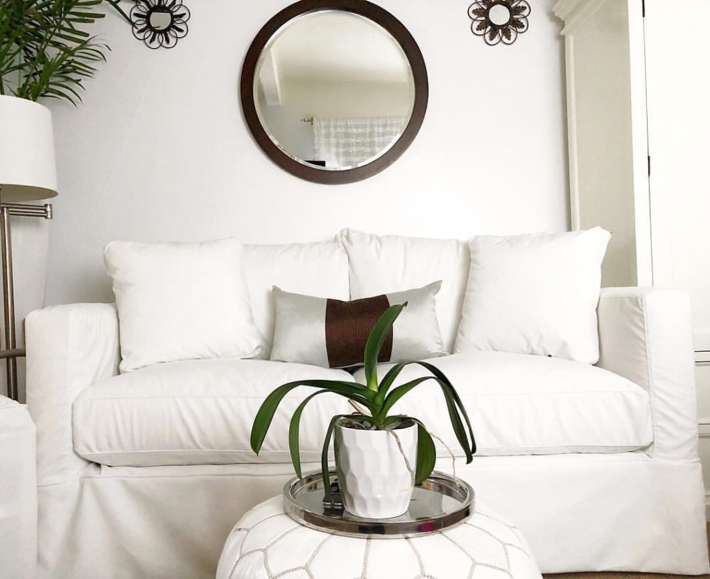 The snow-white couch refreshes the room, accented by a richly-toned pillow. A sleek, round mirror reflects the space, adding depth and light. Greenery on the coffee table introduces nature’s vitality. This minimalist approach highlights each element individually, allowing them to stand out.