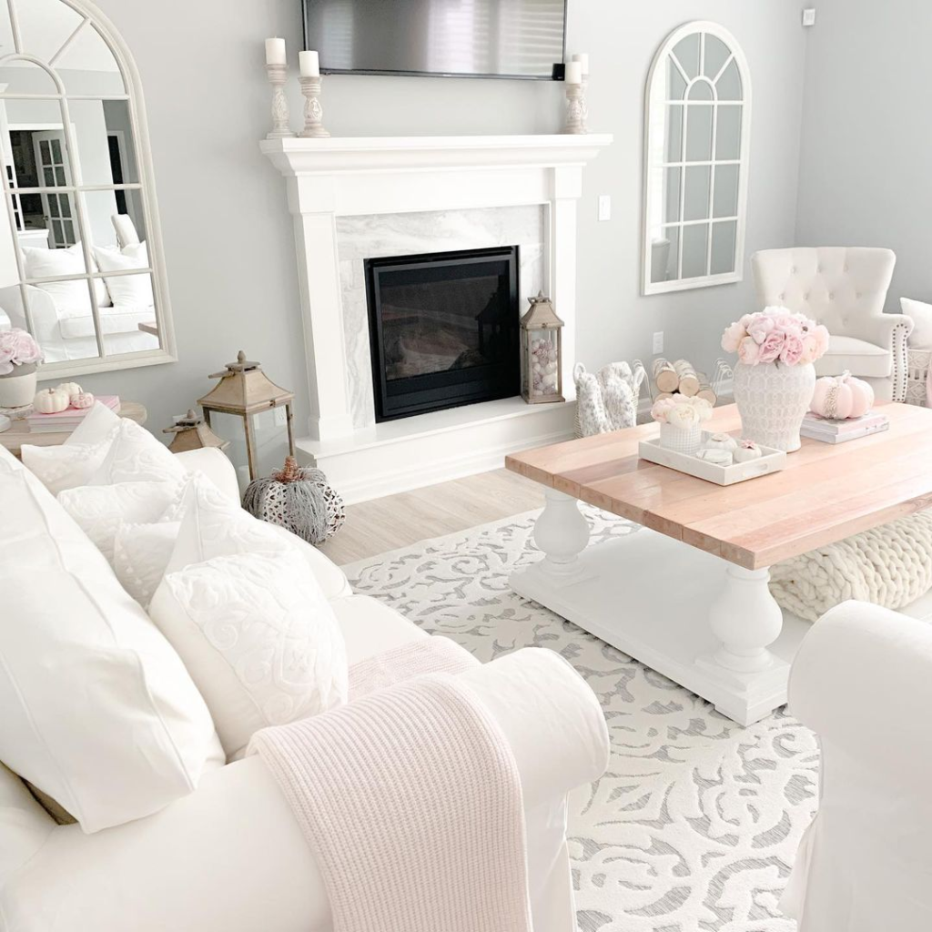Minimalism is embraced with a pristine white couch at the center of the space. Subtle greys and soft pinks enhance the tranquil ambiance, while delicate textures and floral arrangements add sophistication. A grand fireplace serves as the perfect backdrop, completing the serene and elegant setup.