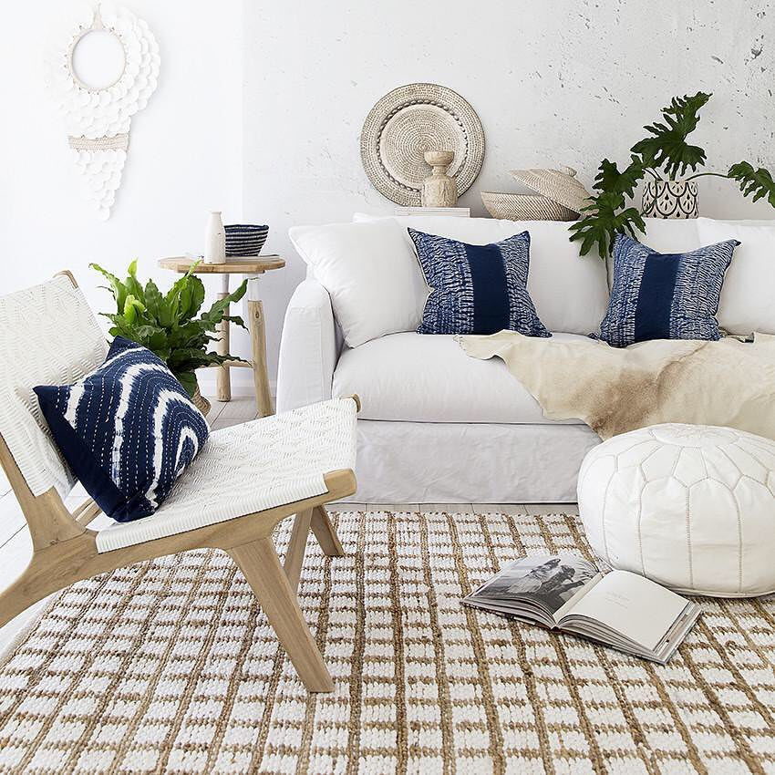 White couches reflect a bohemian spirit when paired with indigo accents. Tribal-patterned pillows and wall decor infuse the space with character. Natural textures and greenery bring life to the room. A unique woven wall hanging completes this boho-chic ensemble.