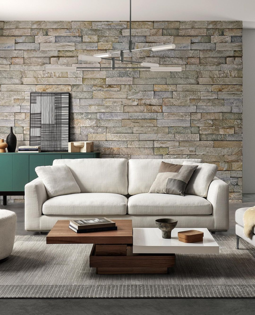 The white couch contrasts with a rugged stone wall, providing textural depth. A sleek coffee table introduces contemporary flair. Neutral tones in the pillows soften the look, and a unique pendant light fixture adds modern artistic appeal.