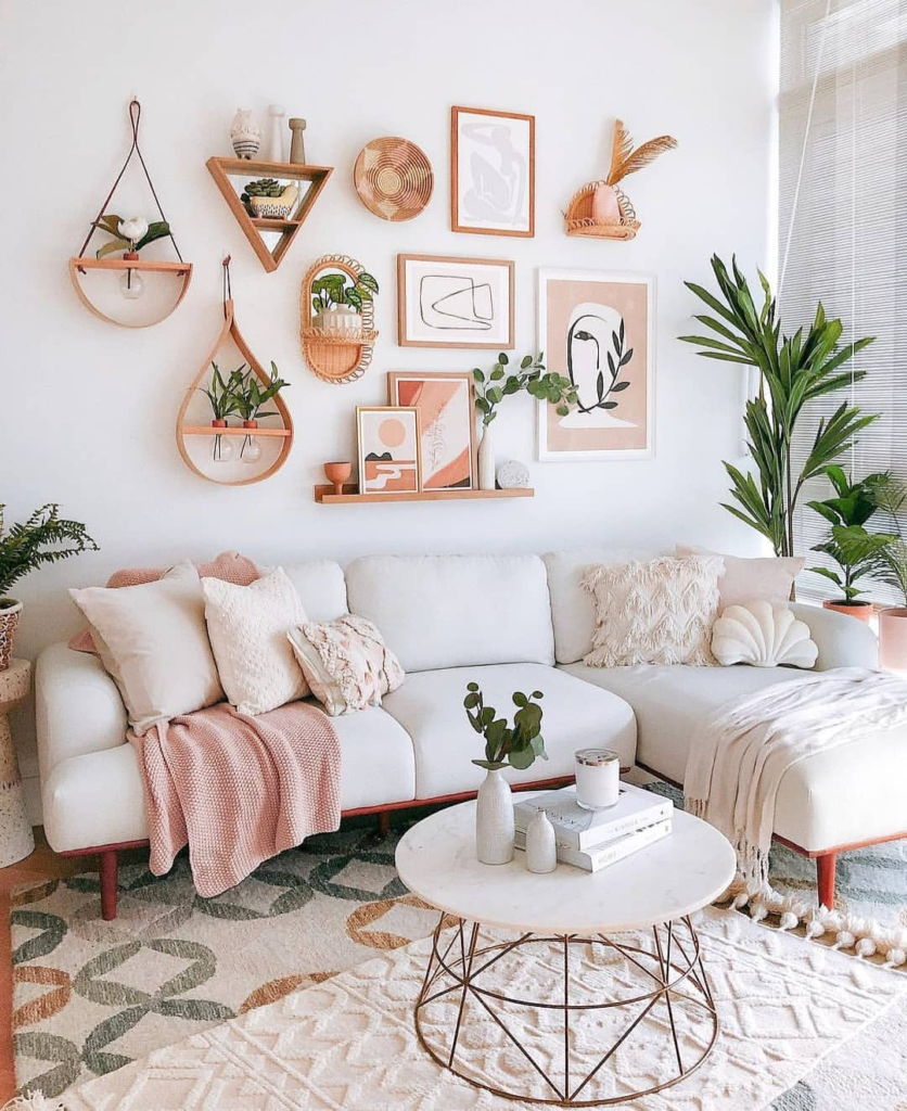 The white couch serves as a base for a vibrant gallery wall with warm, peachy tones. The playful mix of wall decor adds personality, while textured pillows and throws invite comfort. The round marble table and geometric rug blend modern and bohemian styles.