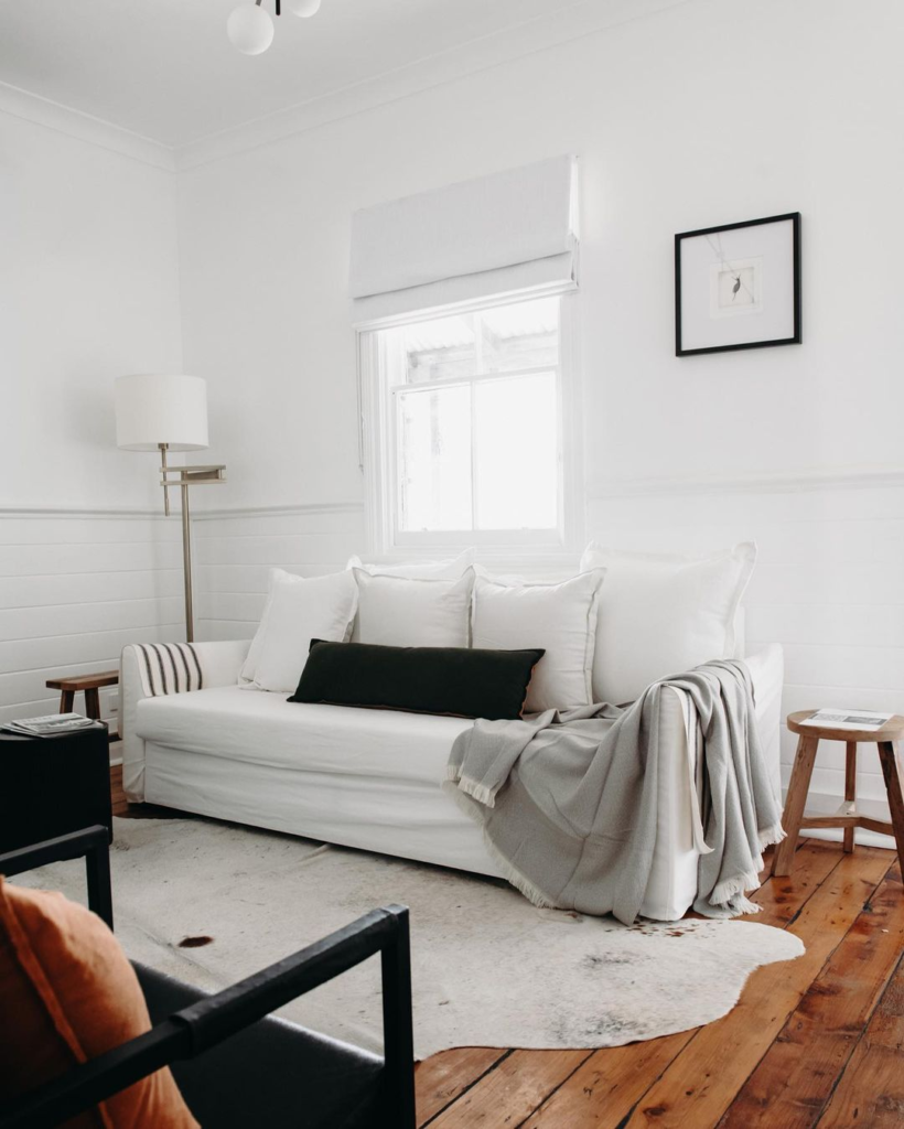 The white couch, adorned with neutral-toned pillows, embodies Scandinavian simplicity. The soft throw adds a layer of comfort, while natural light and minimalist decor highlight a clean aesthetic. Worn wooden flooring adds warmth and character.