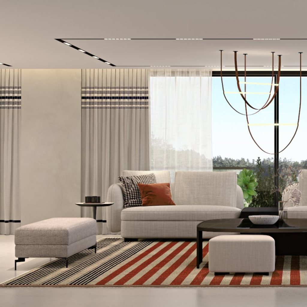 The structured white couch anchors a space characterized by clean lines and modern design. A striped rug adds a playful touch, and accent cushions introduce a pop of color. Dramatic lighting and sheer curtains soften the room’s geometric sharpness.