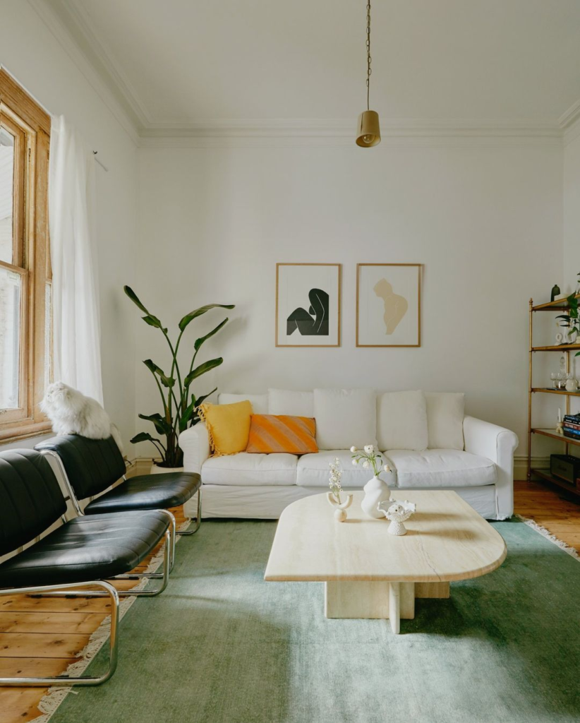 The white couch, adorned with vibrant throw pillows, offers a contemporary twist on vintage charm. Natural wood accents evoke a mid-century modern feel, and a soft, muted rug adds warmth. Abstract art and a minimalistic light fixture provide a modern nod to the space.