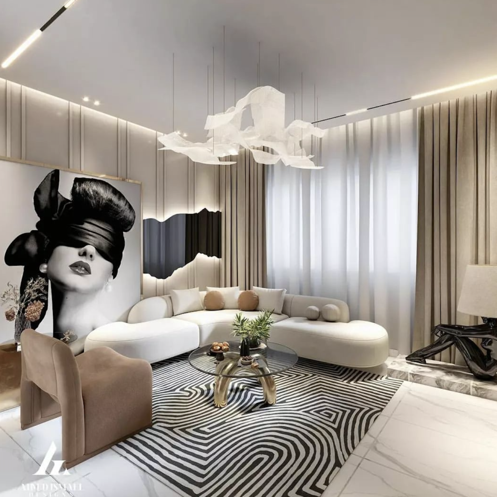 The luxurious white sectional couch makes a bold statement against a dynamic black-and-white rug. Dramatic lighting sculptures overhead enhance the high-fashion aesthetic. An oversized portrait adds visual impact, while muted drapes and soft pillows balance the bold elements with subtlety.