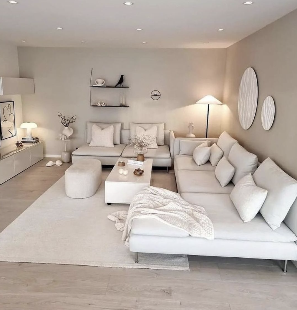 The white couch highlights the soothing power of a neutral palette. Matching tones create a harmonious space, while varied textures from the rug and wall art add depth. Ambient lighting provides a warm and inviting glow, enhancing the room’s serene atmosphere.