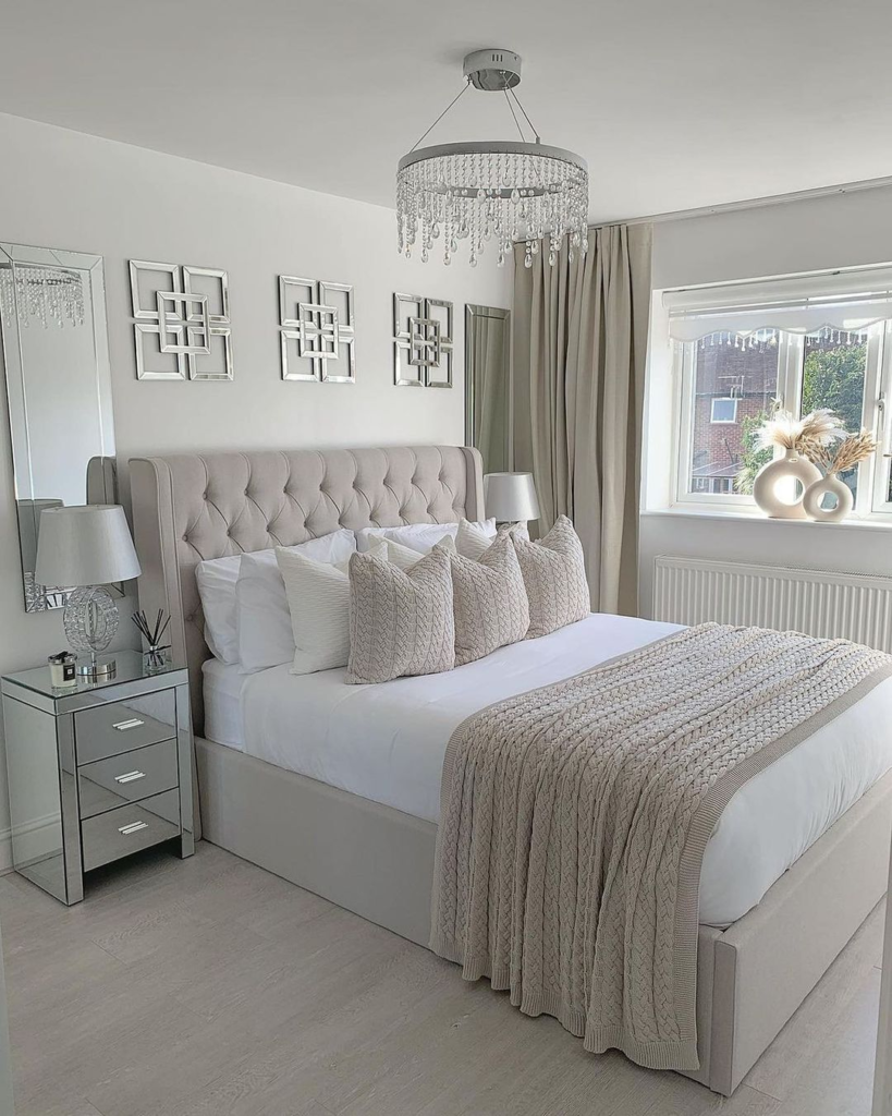 A crystal chandelier introduces a touch of sparkle to this neutral bedroom. Its reflective beauty enhances the soft, muted tones, and the intricate details create a focal point above, adding depth and elegance. This combination brings sophistication and tranquility to the restful space.