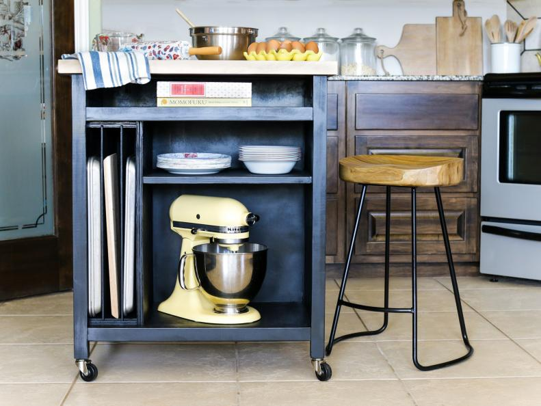 A small, movable island provides extra prep space and can be easily relocated when needed. Use it as a bar cart or plant stand when it’s not in use, offering versatility and additional functionality in your kitchen.