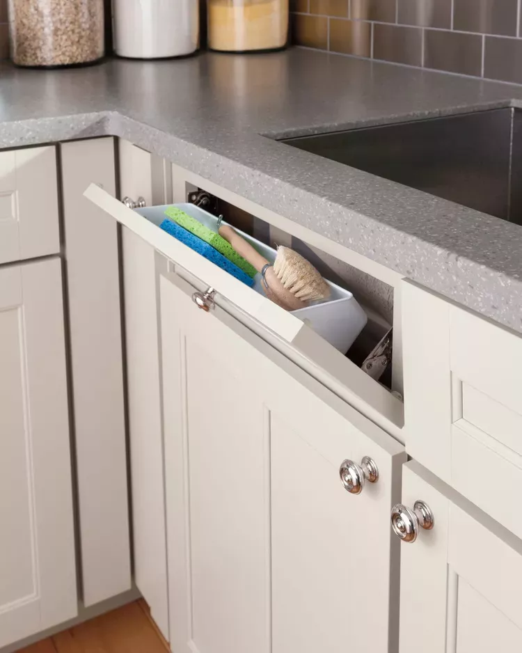 Maximize every inch of your small kitchen with a tilt-down drawer installed near the sink. It’s perfect for storing cleaning supplies and sponges, keeping them accessible and freeing up valuable counter space.