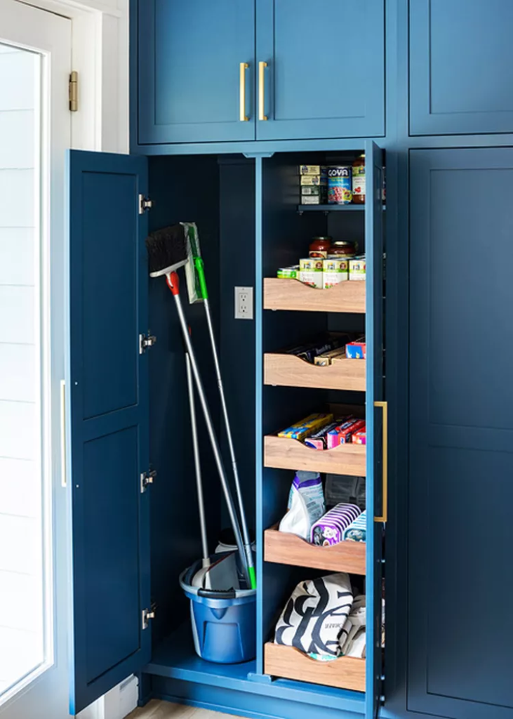 Avoid cluttering your kitchen cabinets with infrequently used items by designating a utility closet for cleaning supplies like brooms and mops. This keeps your kitchen cabinets organized and ensures essentials are readily available.