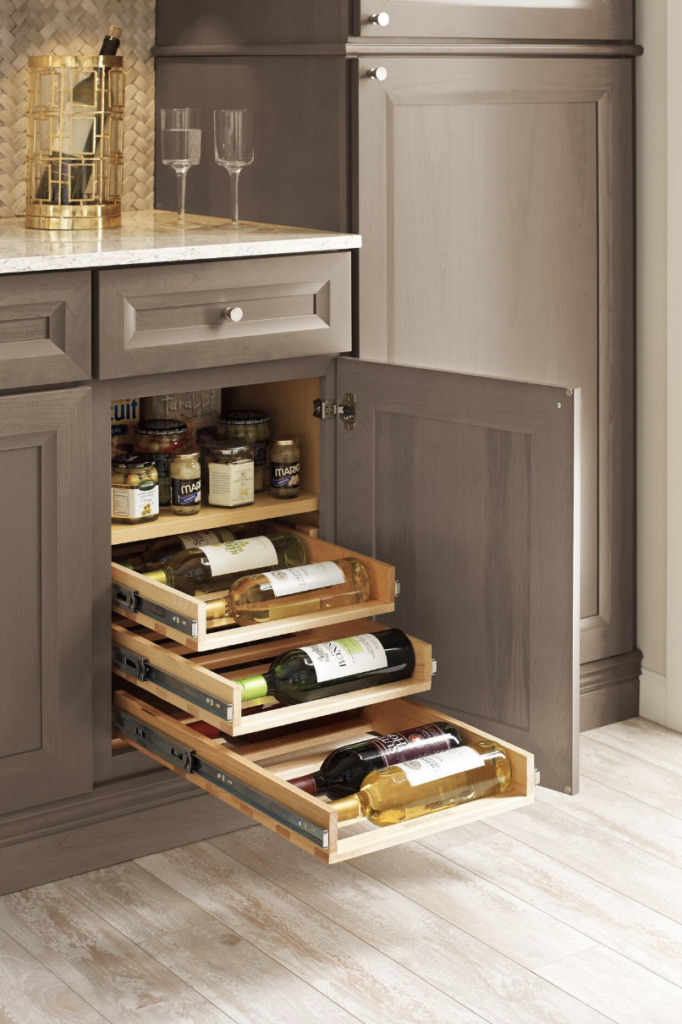 If you love wine but lack space for a mini fridge, consider installing a bottle pull-out system. It’s perfect for storing wine and other beverages, such as juice or olive oil, keeping your kitchen organized and accessible.
