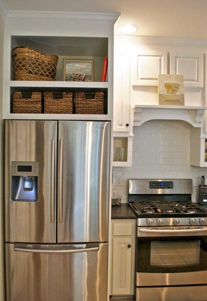 Make use of the space above your refrigerator by installing slim cabinets or open shelves. This area is perfect for storing items like extra pantry staples or seasonal cookware. Use baskets or canisters to keep it organized and visually appealing.
