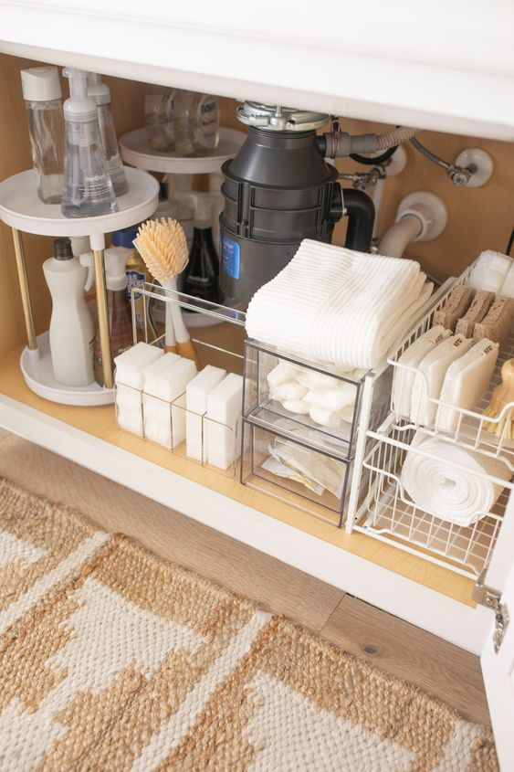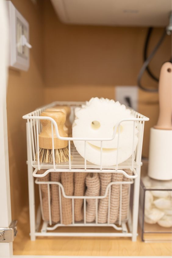 An under-the-sink organizer is ideal for making use of the often-neglected space beneath the sink. It provides a structured way to store cleaning supplies and other items. This organizer helps keep the area neat and ensures your items are easy to access.