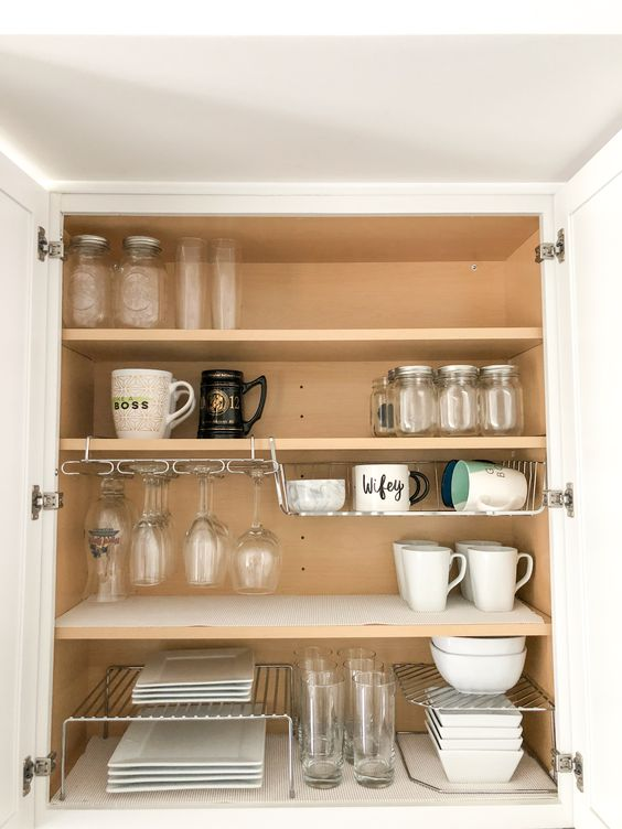 A cup hanger is an effective way to store cups in your kitchen cabinet. It allows you to hang cups neatly, saving space and keeping them easily accessible. This solution is ideal for kitchens with limited storage options.