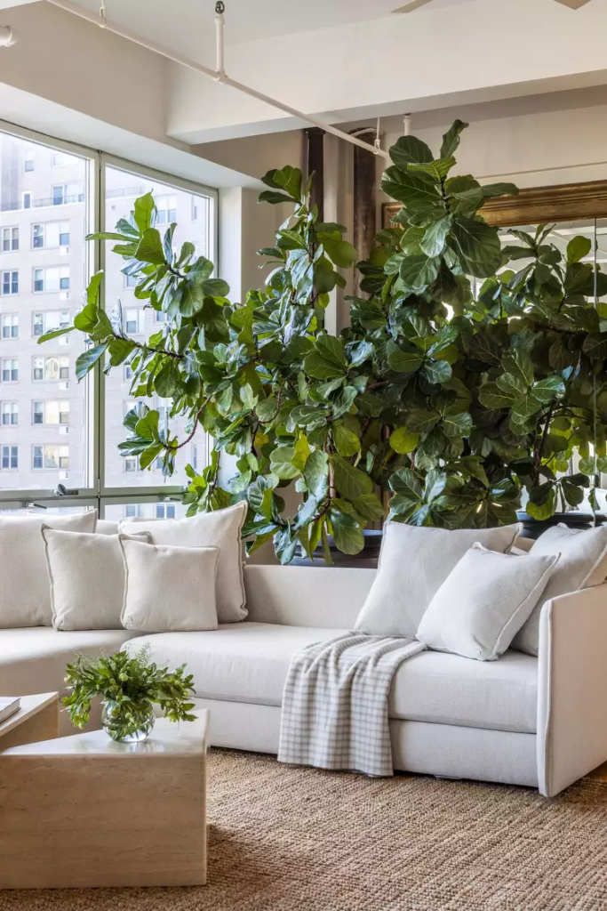 Introduce a large houseplant to bring a touch of nature into your living room. Consider indoor trees like fiddle leaf figs or rubber trees, which add style and a natural element, provided you have enough light to support their growth.