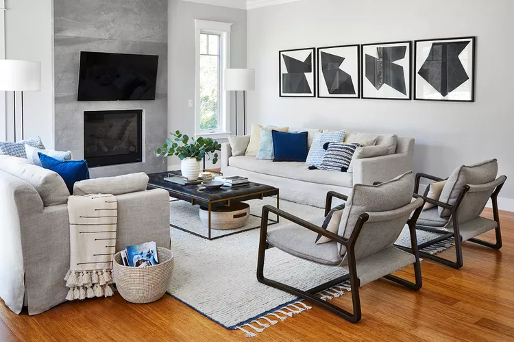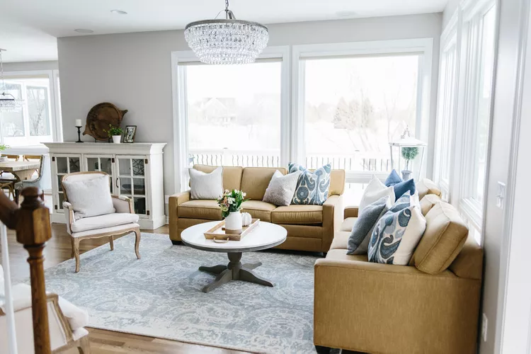 Anchor your large living room with a sizable area rug to create a cozy and defined seating area. If one rug isn’t enough, consider using multiple rugs to delineate different zones within the room.