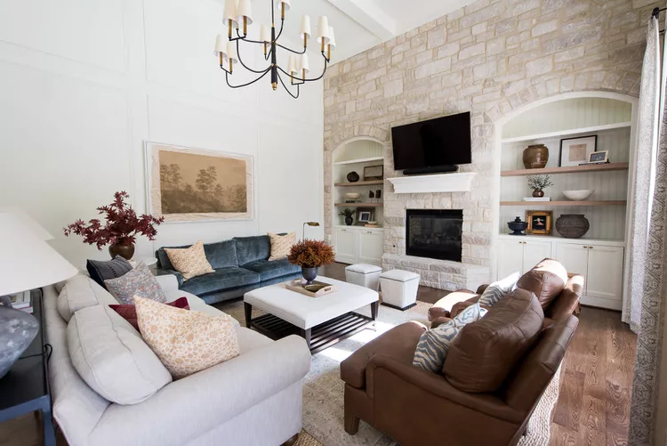 Incorporate a stone accent wall to introduce a rustic charm to your living room. This feature can become a focal point when paired with built-ins, a fireplace, or a TV, blending functionality with aesthetic appeal.