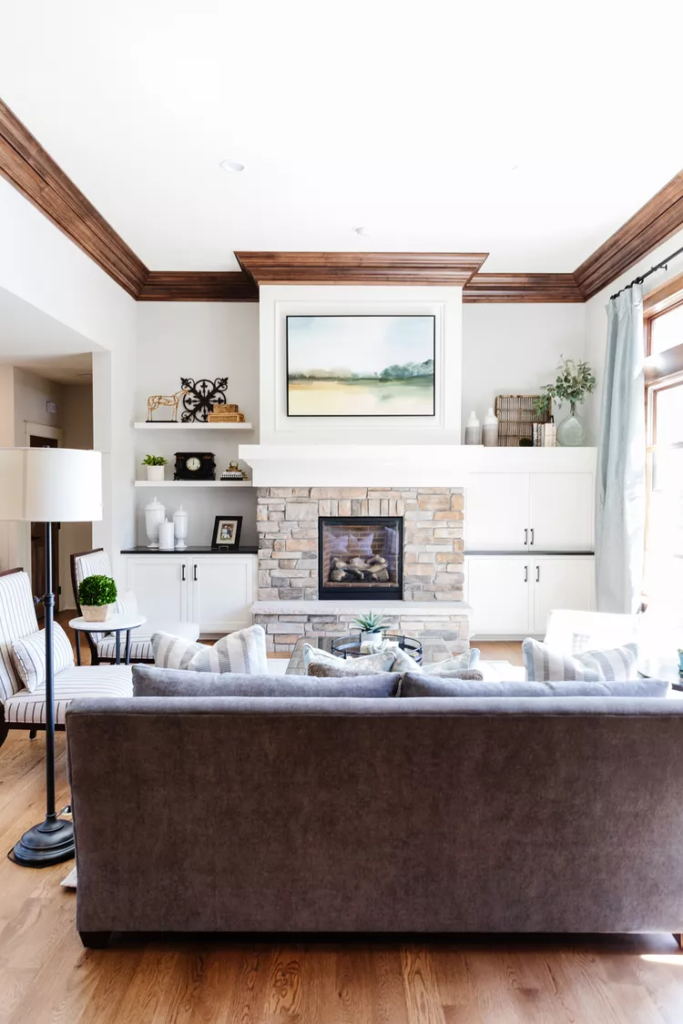 Enhance the appearance of your large room with crown molding, which adds an elegant touch and draws the eye upward. This classic detail is available in various styles and can make your ceilings seem higher.