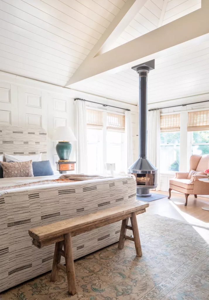 Kate Marker Interiors has designed a charming cottage bedroom featuring a retro wood-burning stove. The stove, set against a backdrop of rustic ceiling beams and a metal firewood rack, adds authenticity and warmth to the white-washed modern farmhouse decor.