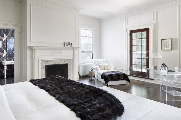 Kara Mann highlighted the classic millwork and fireplace of this spacious Illinois bedroom office with soft white paint, creating a light and airy feel. The contrast of dark flooring and black accents with a clear lucite desk and chair enhances the room’s classic yet modern decor scheme.