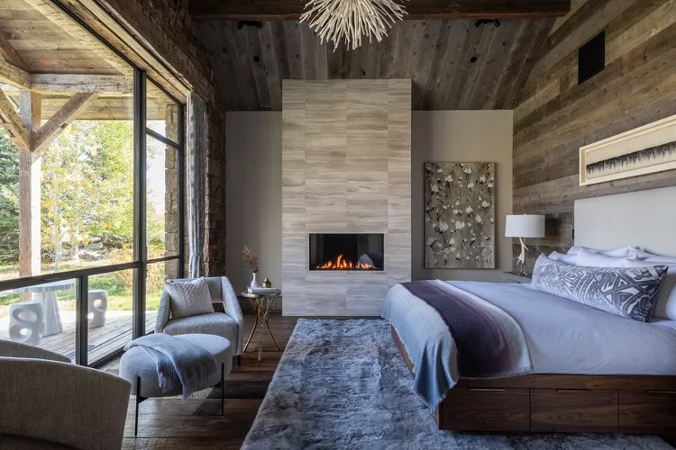 In Jackson Hole, WY, JLF Architects designed a serene primary bedroom where a contemporary honed limestone fireplace serves as a focal point. The space combines rustic and modern elements, including salvaged barnwood walls and plush textiles, creating a harmonious atmosphere.