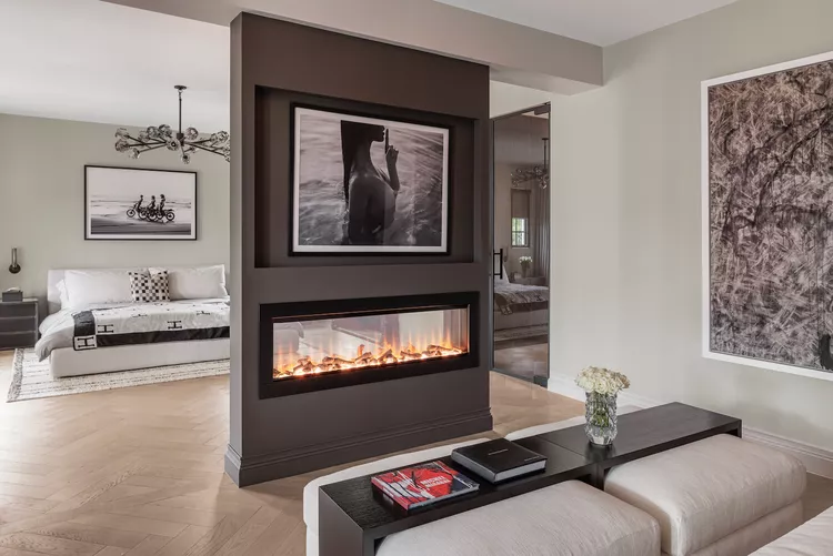 House of One introduced a double-sided fireplace to separate the sleeping and sitting areas in this Miami Beach primary bedroom. A black-and-white photograph over the mantel ties in with the art displayed throughout the room, adding a cohesive touch.