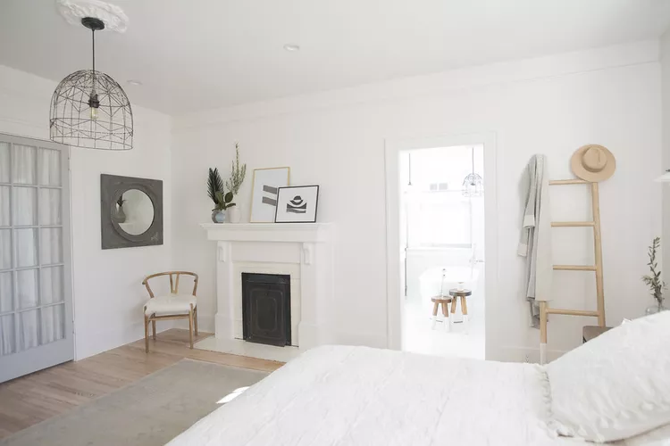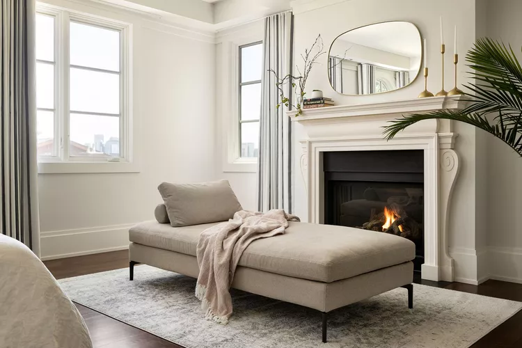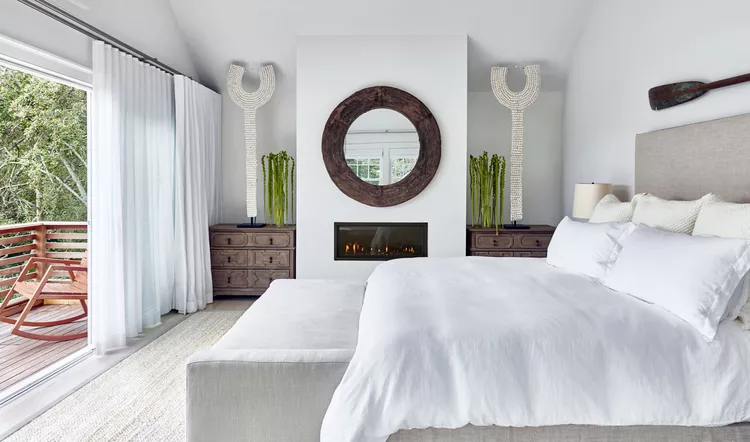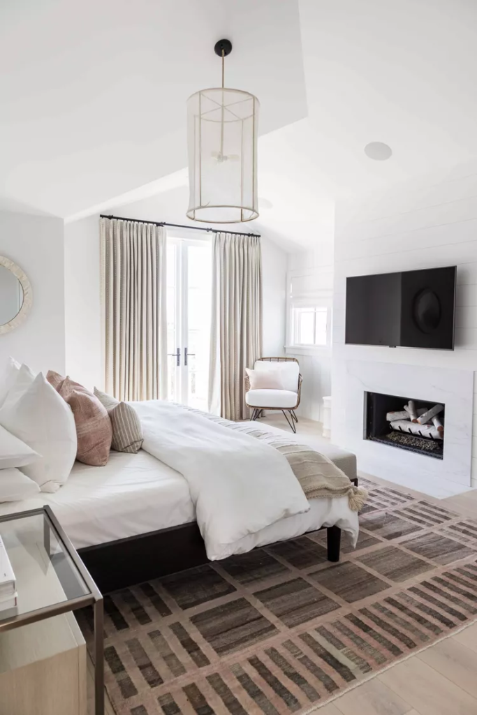 Even in a warm climate, a fireplace can add a cozy touch to a modern space. In this Southern California bedroom, Mindy Gayer Design Co. used a white marble firebox frame against a white shiplap wall, while the black interior adds definition. White logs are used decoratively when the fireplace is not in use.
