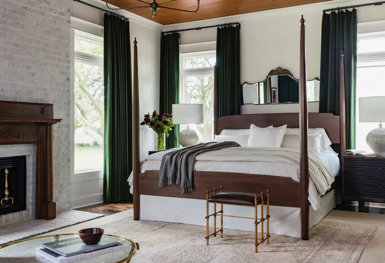 Marie Flanigan Interiors chose a dark wood stain for the fireplace surround, complementing the imposing canopy bed in this bedroom. The rich wood tones contrast with the whitewashed brick fireplace wall, and forest green velvet drapes enhance the room’s warmth and character.