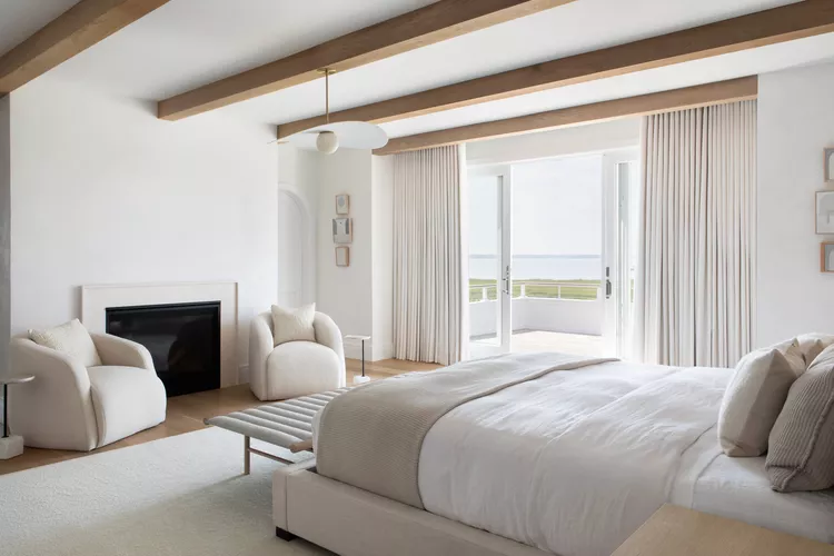 In this tranquil modern waterfront bedroom, Chango & Co. used a thin white frame to define a minimalist fireplace. The black firebox and overstuffed armchairs create a cozy seating area, while decorative wood beams add warmth to the neutral-toned room.