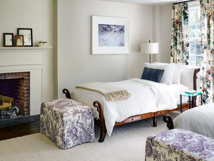 Kara Mann preserved the charm of a historic farmhouse guest room in Pound Ridge, New York, with a classic white-painted wood and brick fireplace. The room is updated yet timeless, featuring period twin bed frames, floral textiles, and crisp white linens.