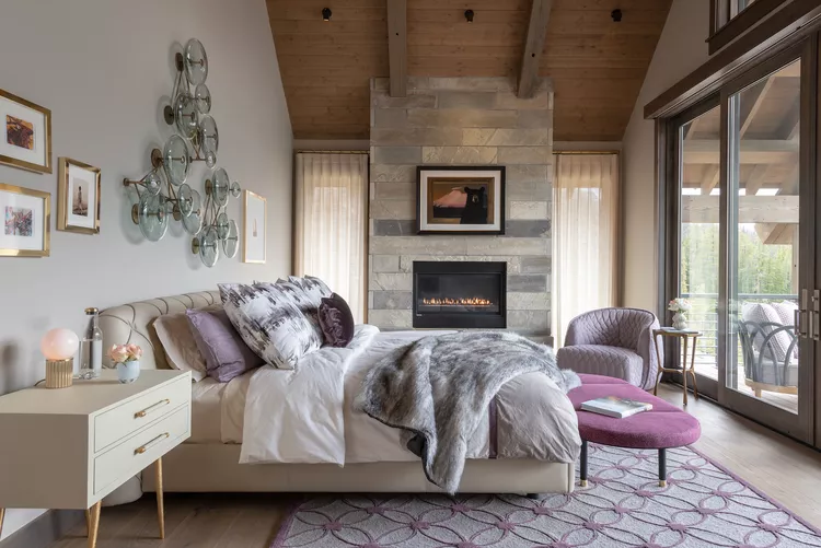 Envi Interior Design Studio designed this bedroom with a fireplace wall in varying shades of gray, evoking the “blue bird” powder days of winter. The luxurious Poltrano Frau bed and soft gray, mauve, and lavender accents contribute to a calming and inviting atmosphere.
