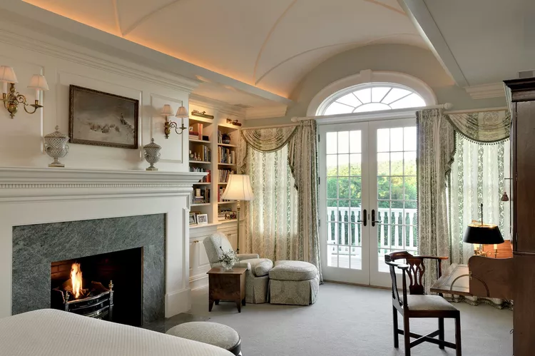 In this country bedroom, Crisp Architects featured an extra-tall antique carved mantel in dark wood, with a brick interior that feels timeless. Overstuffed armchairs and a round tea table create a charming spot for relaxation.