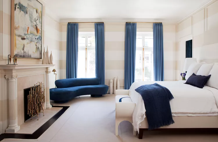 Heather Hilliard Design added classic columns to the fireplace in this neutral-toned bedroom, giving it a formal appearance. A contemporary fireplace screen and navy accents, including a rounded sofa and wide-striped walls, provide a modern twist.