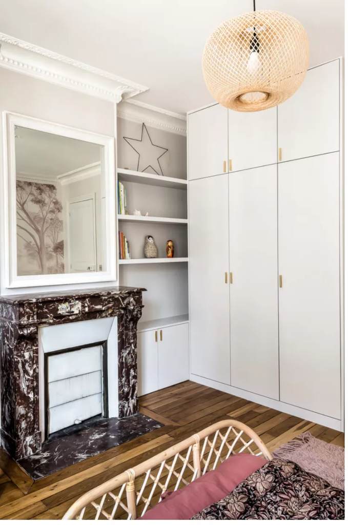 Caroline Andreoni Interior Design preserved the historic character of a marble fireplace in this Parisian kids’ room while adding a built-in guard for safety. The fireplace maintains the room’s classic charm and original appeal.