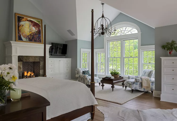 Crisp Architects incorporated modern LED lighting and antique sconces into this traditional-style bedroom. The classic white wood and stone fireplace is complemented by light fixtures that ensure balanced illumination throughout the room.