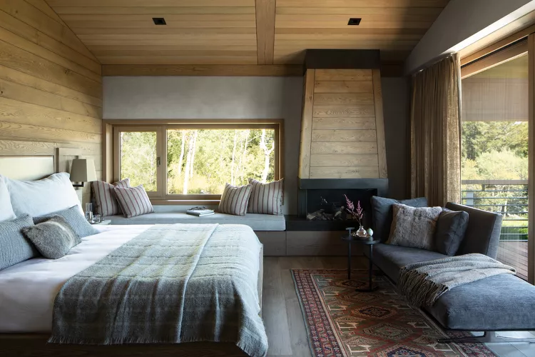 WRJ Interior Design added a corner fireplace to this Jackson Hole home, inspired by Swiss chalets. The fireplace is accessible from both the bed and seating areas, enhancing its functionality and charm.