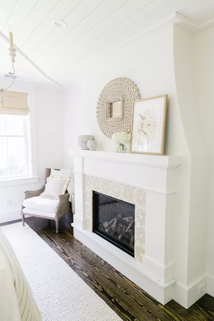 Finding Lovely refreshed this primary bedroom fireplace with a patterned tile surround in subtle floral designs. The light neutral tones of the tiles blend seamlessly with the room’s whites and beiges for a unified look.