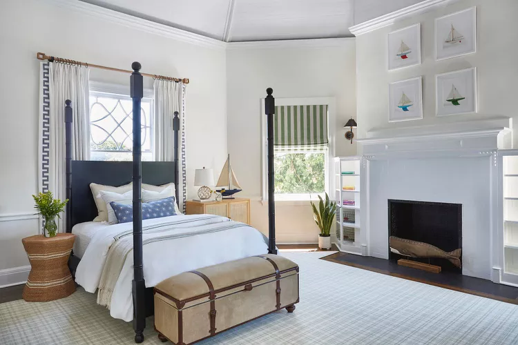 Curated Nest Interiors updated a clean-lined white fireplace in this nautical-themed bedroom. The fireplace is decorated with framed sailboat prints and sailor stripes on the window shades, reinforcing the room’s theme.