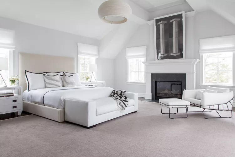 Chango & Co. used a black-and-white fireplace to create a striking focal point in this neutral-toned bedroom. The tall vertical print above the fireplace complements the pitched ceilings and enhances the minimalist decor.