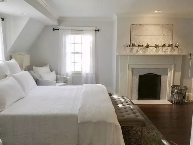 Thistlewood Farms featured a large fireplace with an overmantel in this farmhouse bedroom. The painted columns and built-in mirror add a classic decorative touch, blending history with modern farmhouse style.