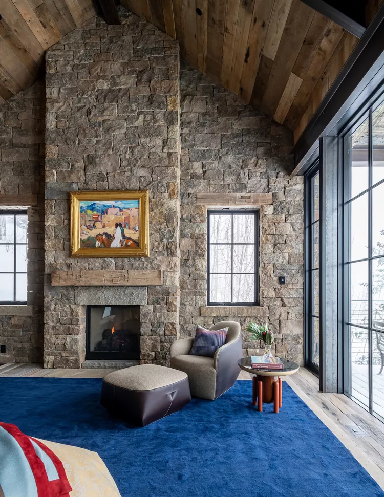 Kibler and Kirch’s design for a primary bedroom atop Heart Mountain in Cody, WY, evokes the Old West with its regional artwork and bearskin rug. The rustic corner stone fireplace enhances the room’s vintage charm, creating a nostalgic retreat amidst the dramatic mountain scenery.
